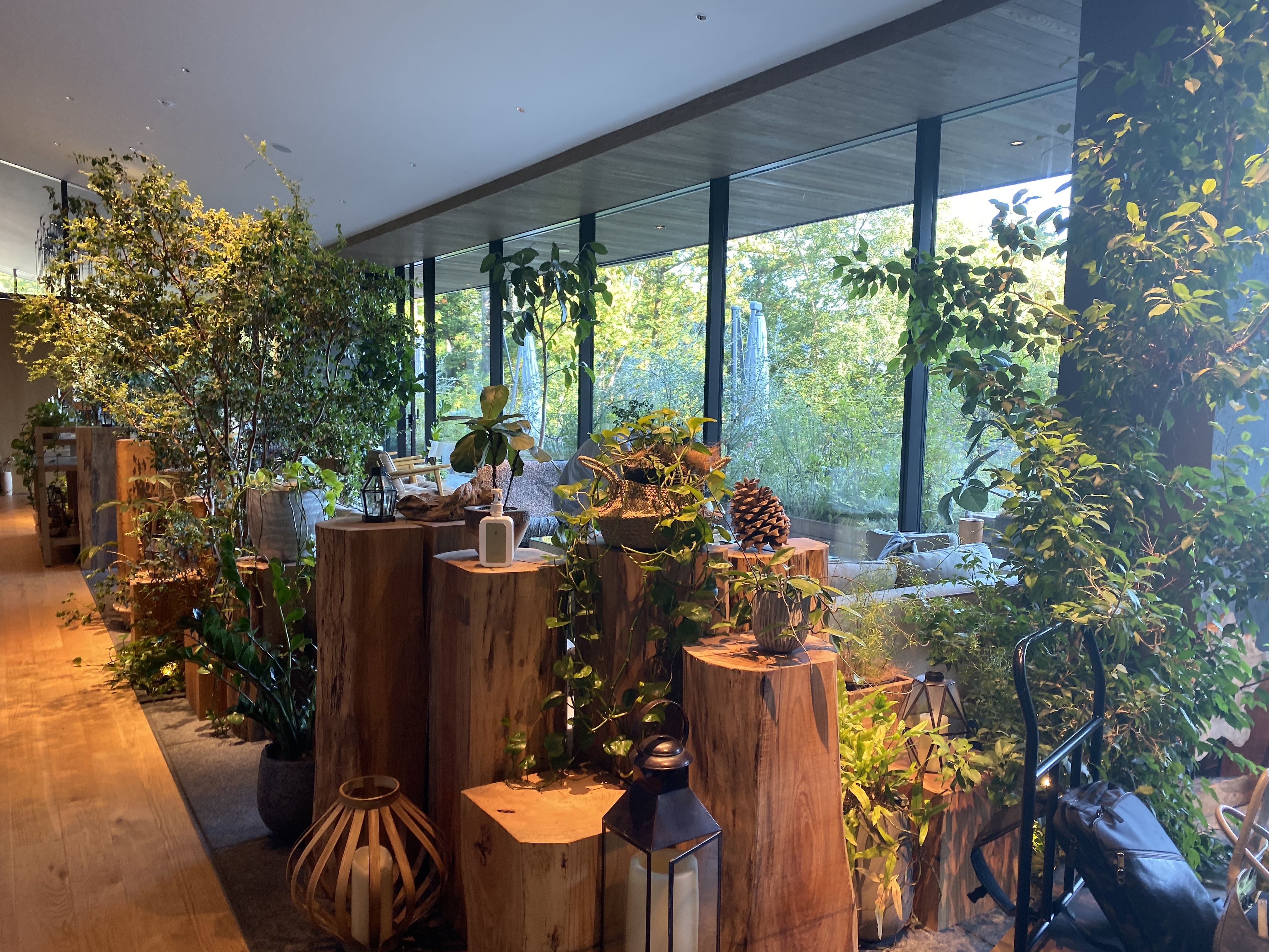 よく写真で見るこのエントランスの写真、実物が見れた!とてもセンスよく植物と木材が並べられていてすごくおしゃれ。