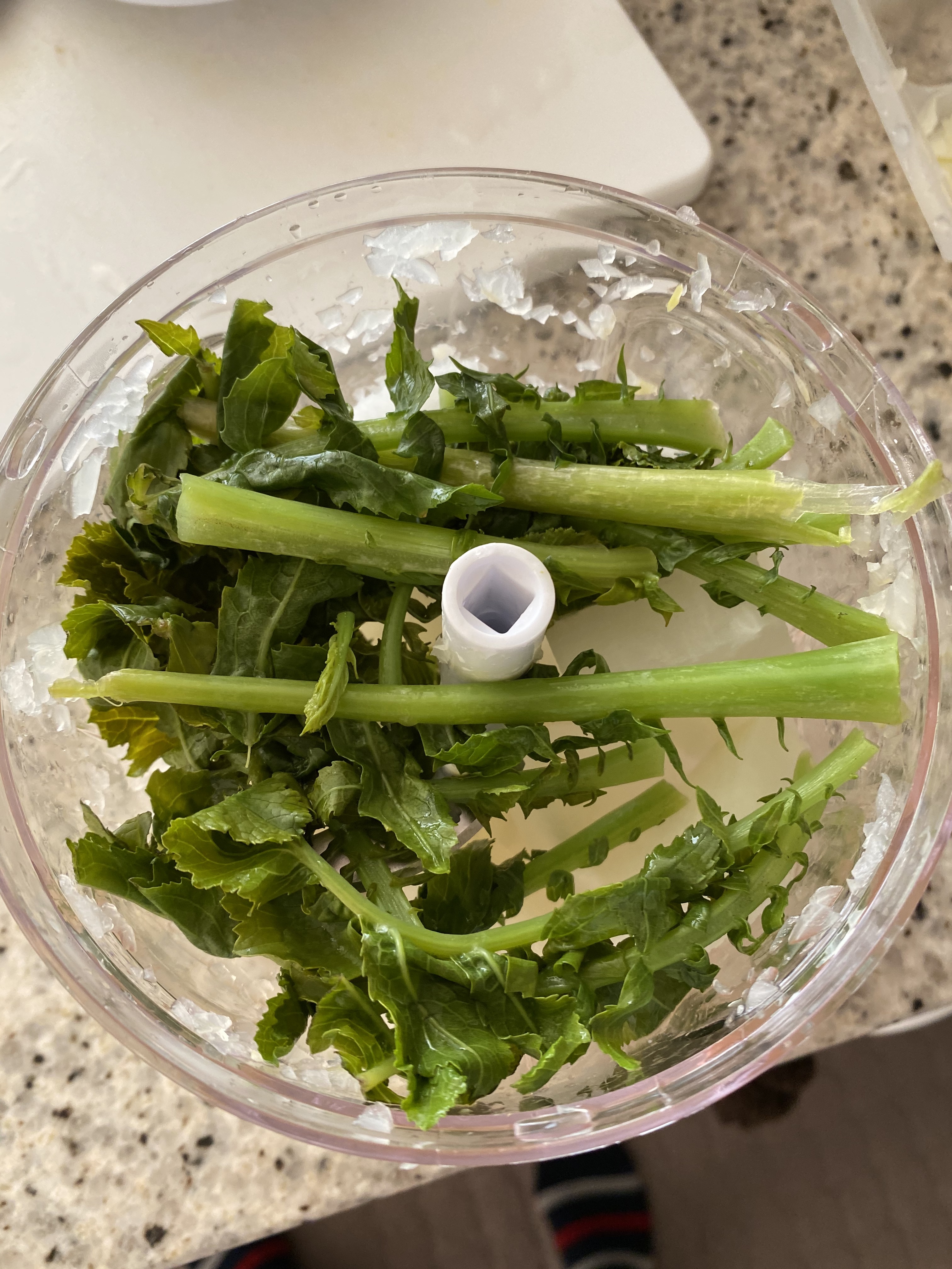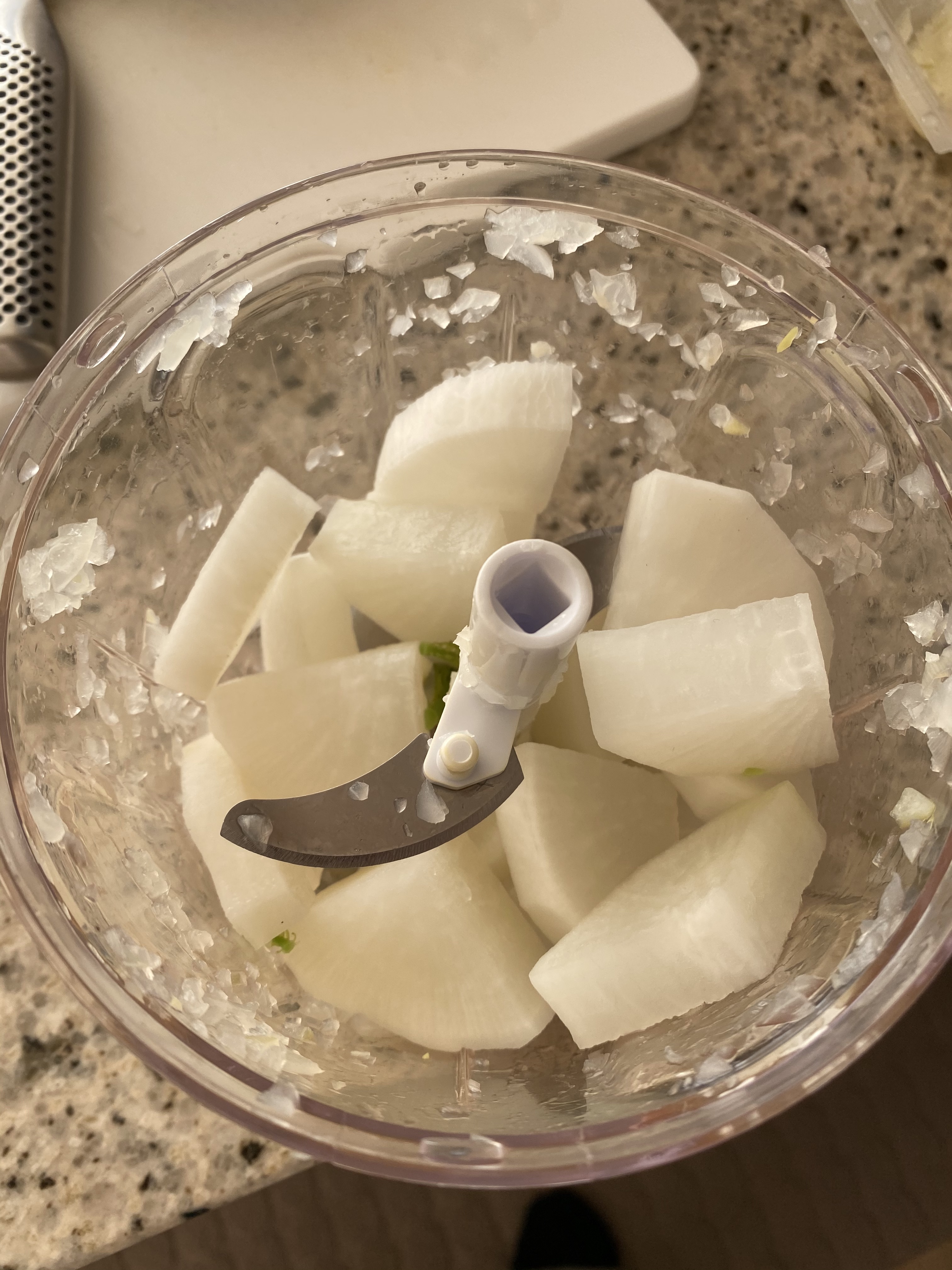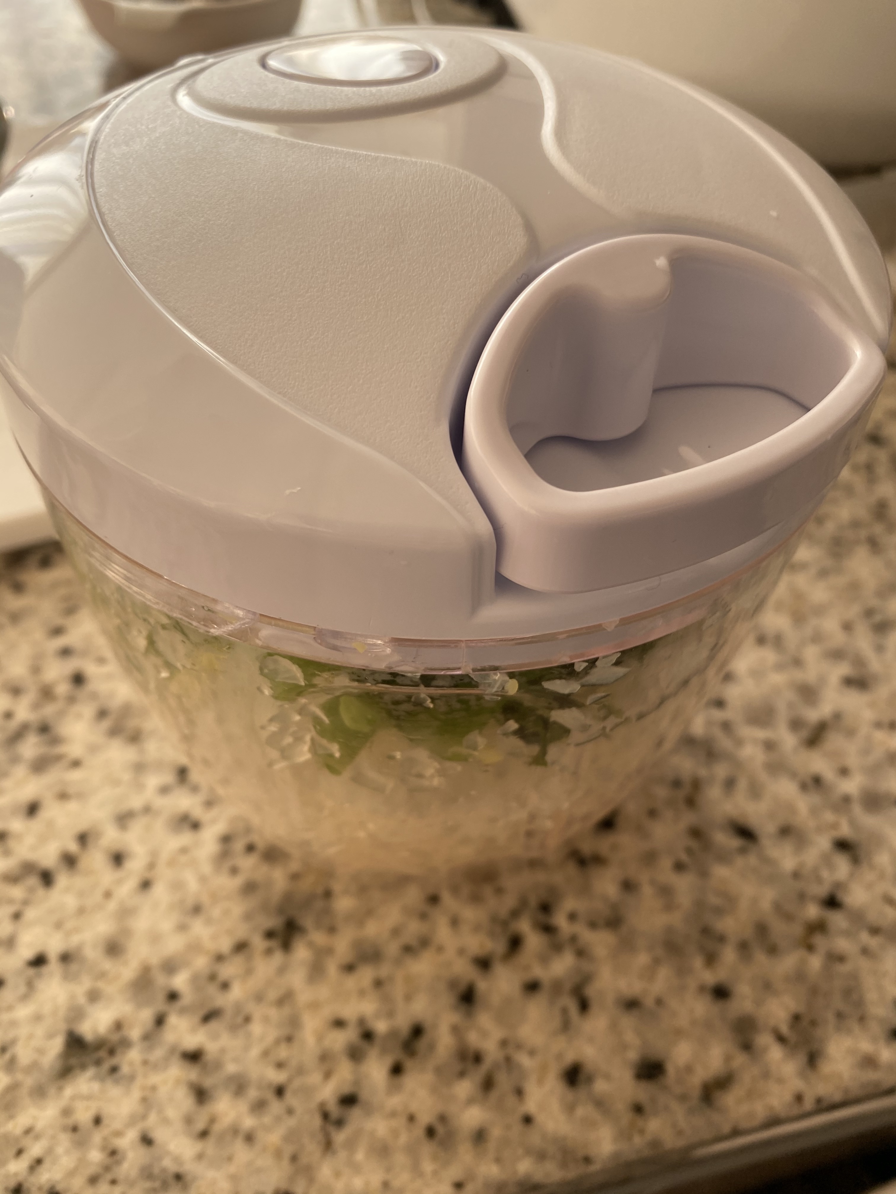 それでは、さっそく蒸し終わった野菜をぶんぶんチョッパーに入れます。