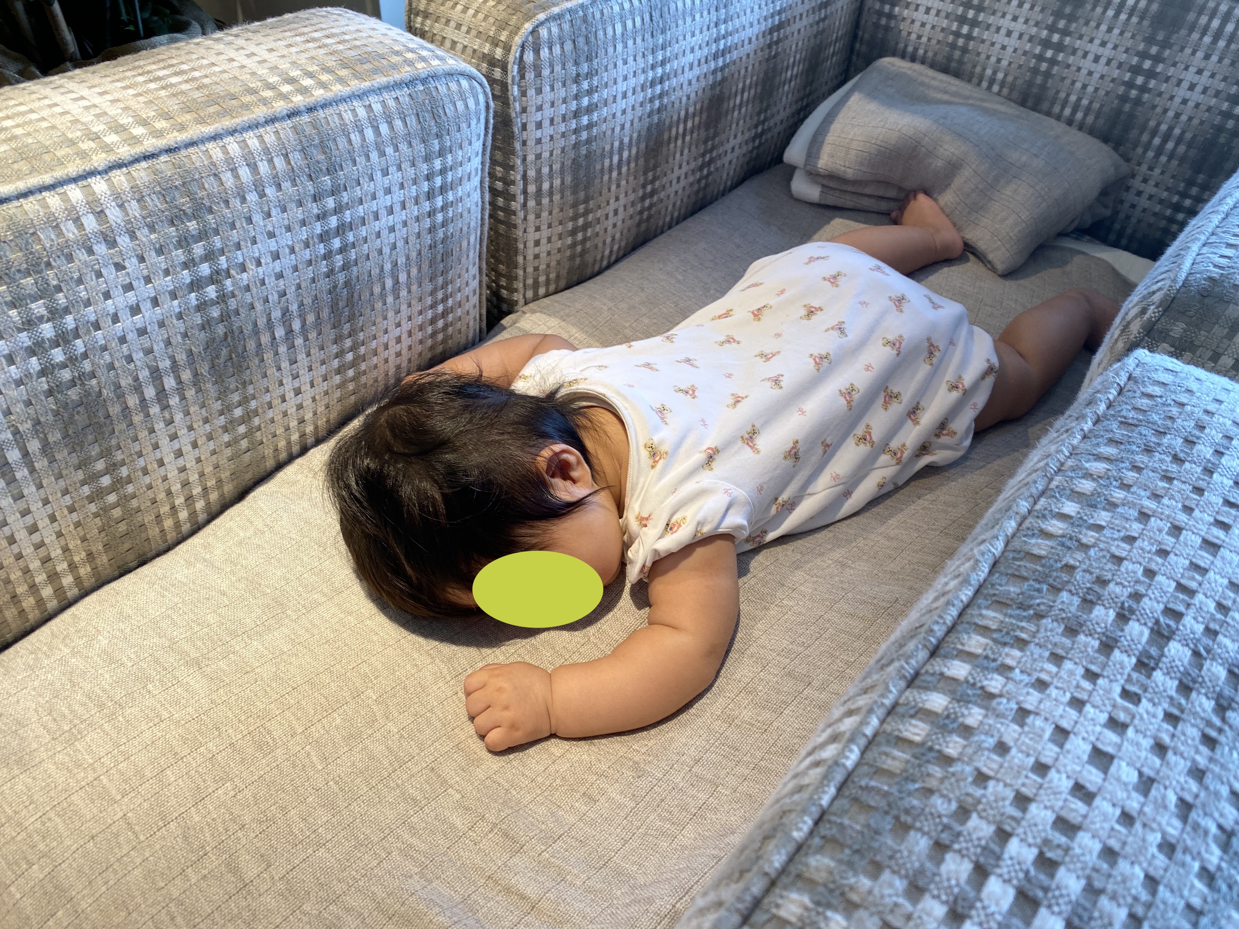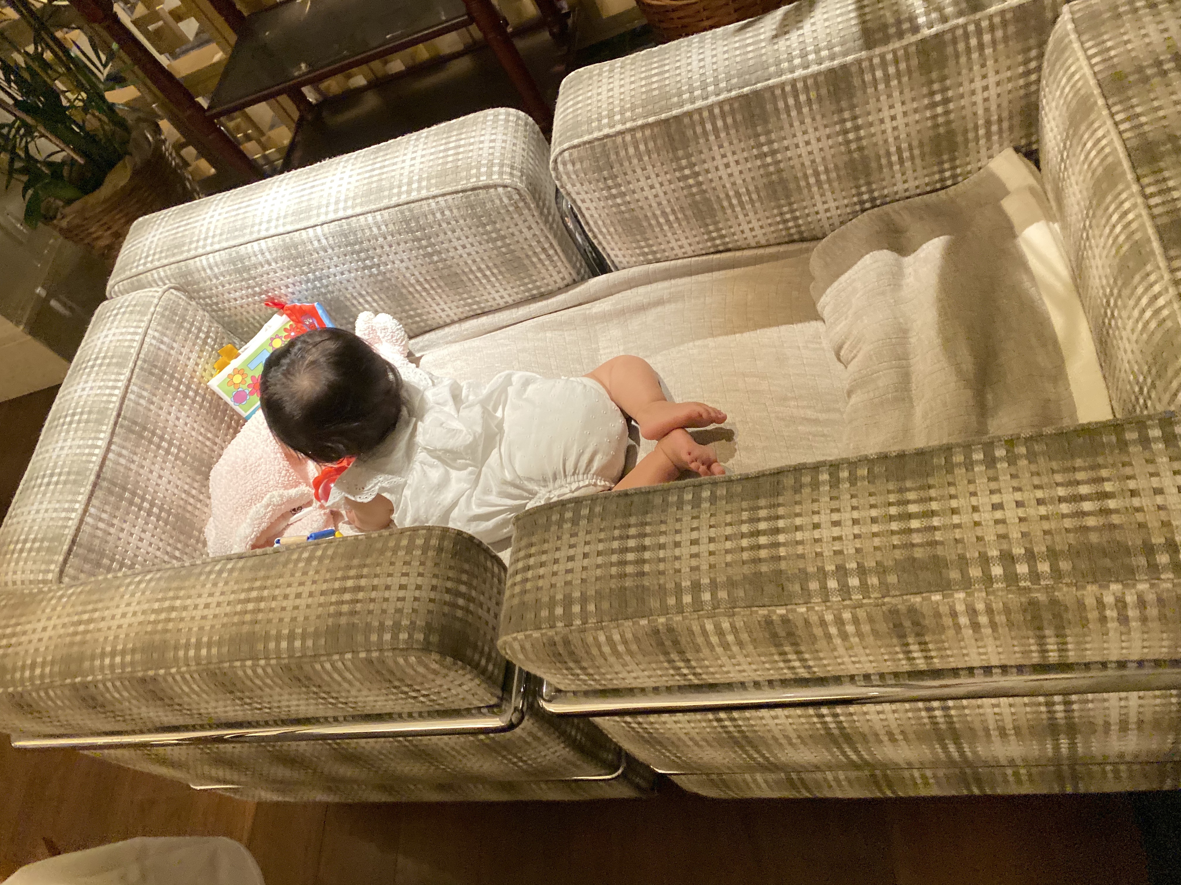 - レストランで1人がけソファを2つくっつけて簡易ベビーベッドを作ってくれた