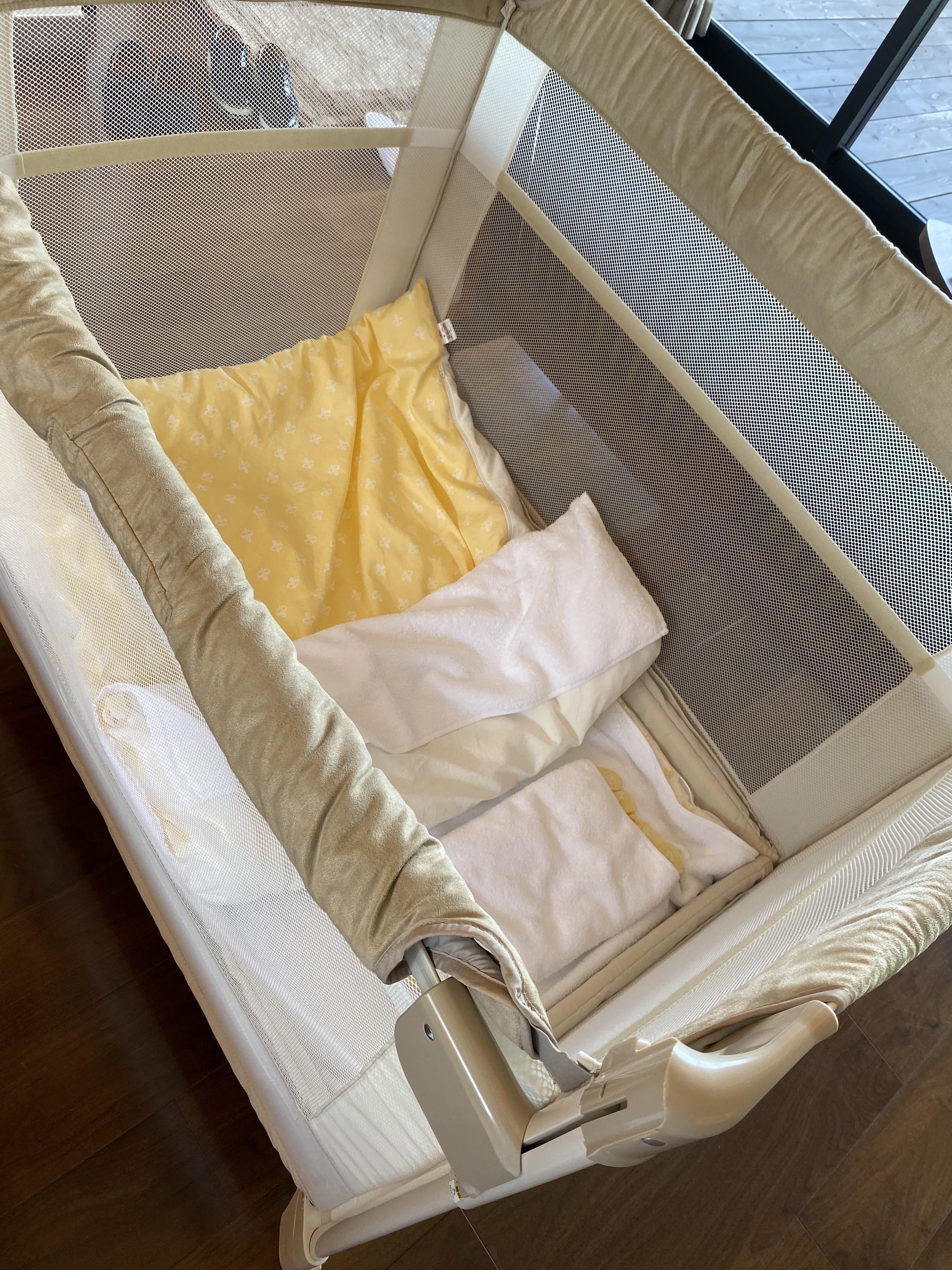 簡易ベビーベッドの中にはブランケットを敷いてもらっています。