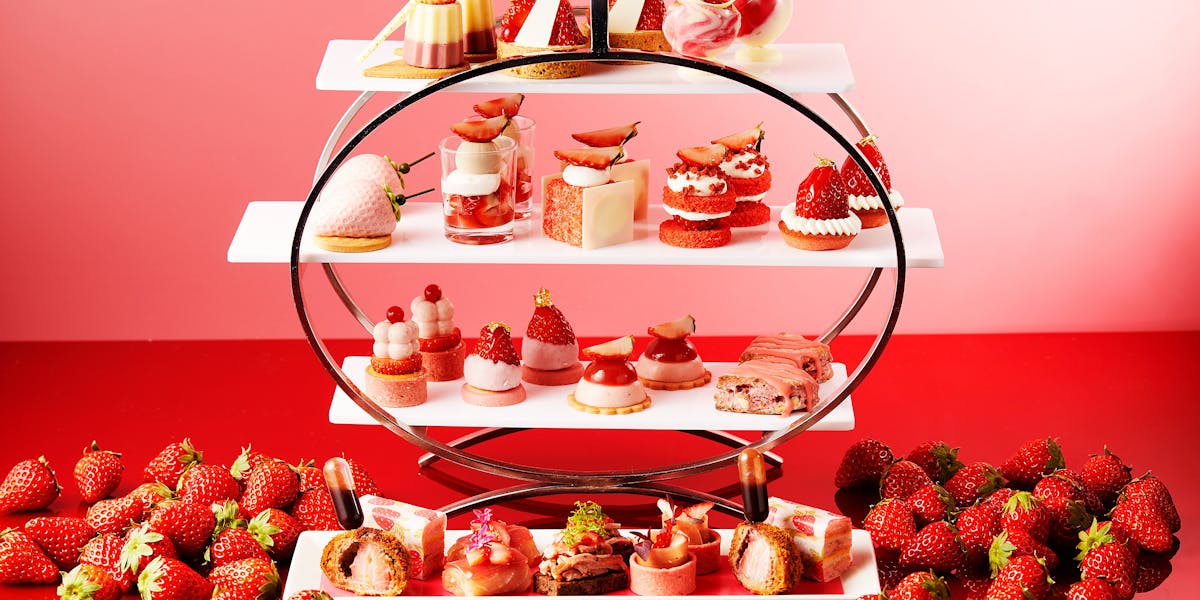 いちごの瑞々しい味わいを堪能できるアフタヌーンティー。フォトジェニックなストロベリースイーツ12種とセイボリー5種を、26種のドリンクと共にお楽しみいただけます。甘酸っぱい香りに包まれる、至福のひとときをお過ごしください。