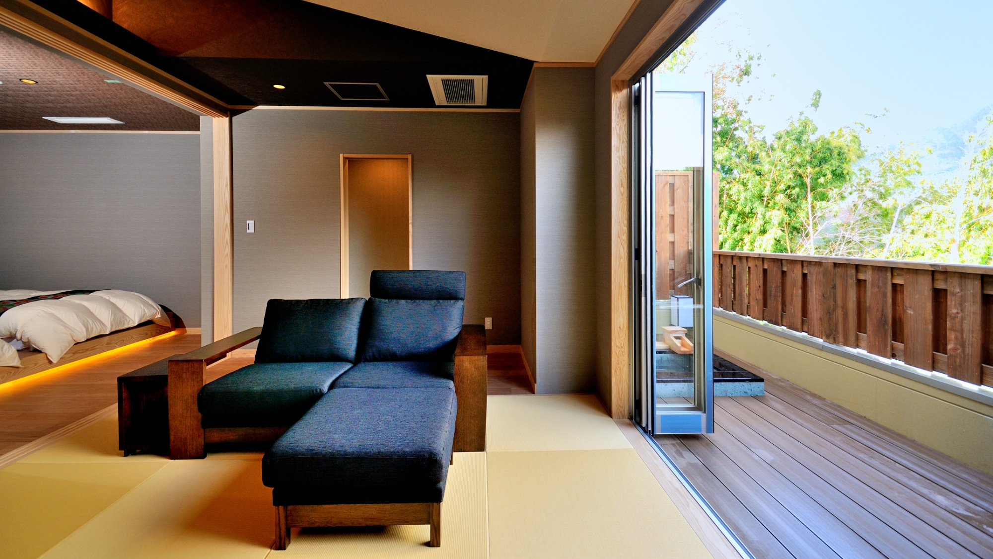 全室に備えた温泉露天風呂、三つの貸切風呂、最上階には二つの展望露天風呂がある高級宿。