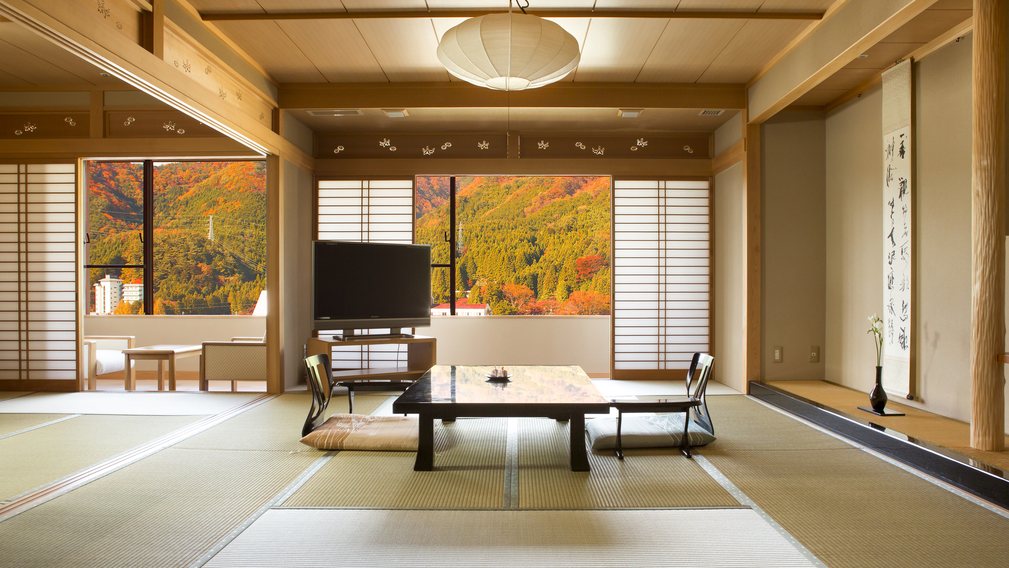 全室74平米以上を誇る広々とした客室からは、鬼怒川の清流を一望できます。不定期で人力車サービスもあり、非日常を楽しめます。