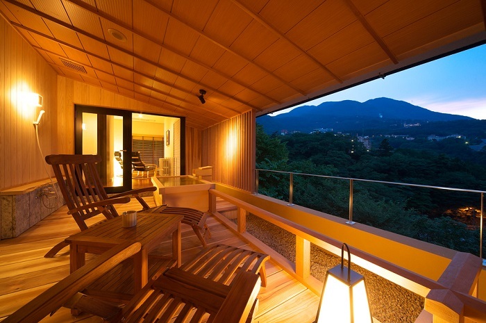 源泉浅間の湯を贅沢に掛け流す2つの趣の異なる貸切露天風呂と、全館畳敷きで素足で快適に過ごせます。