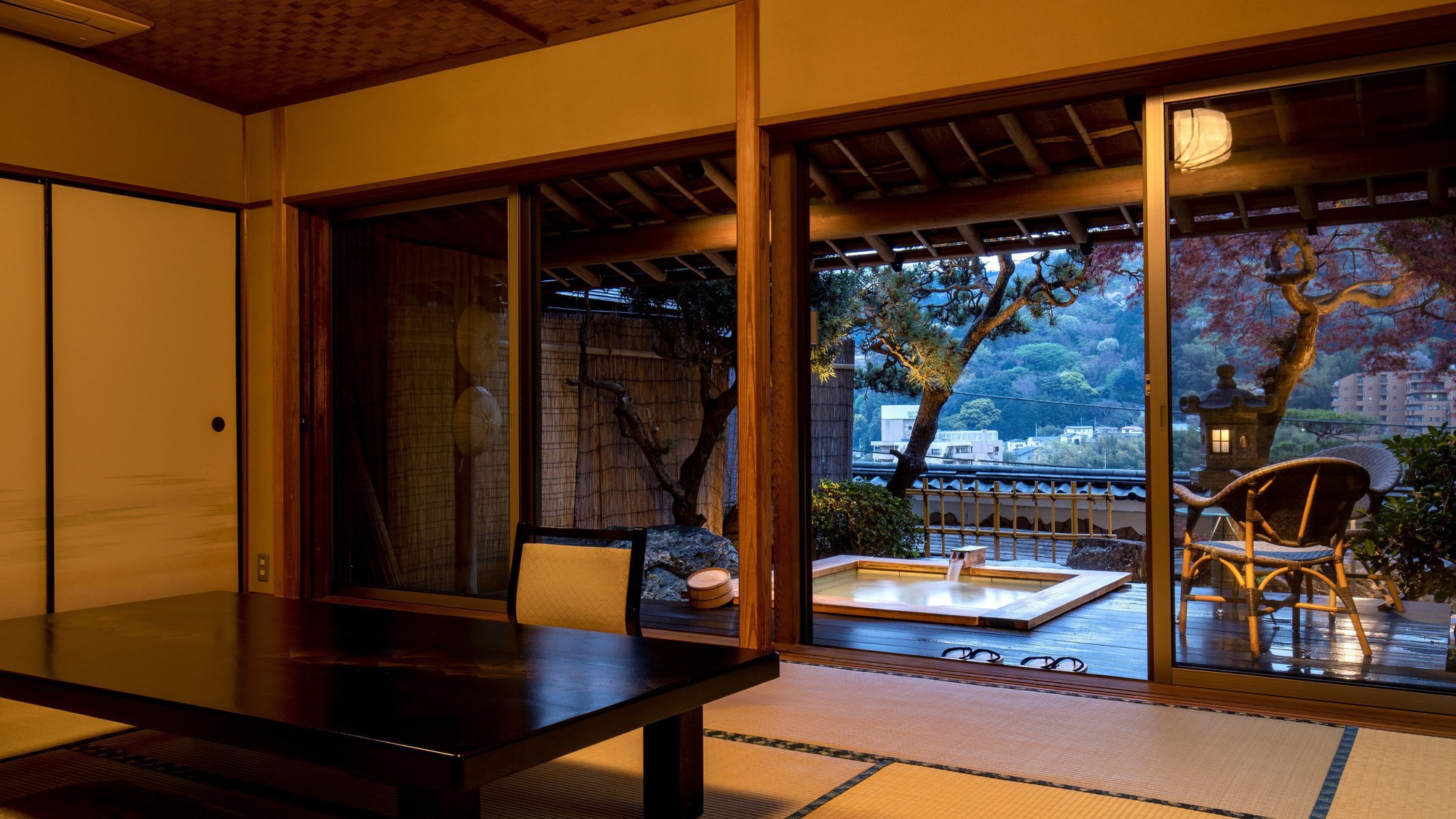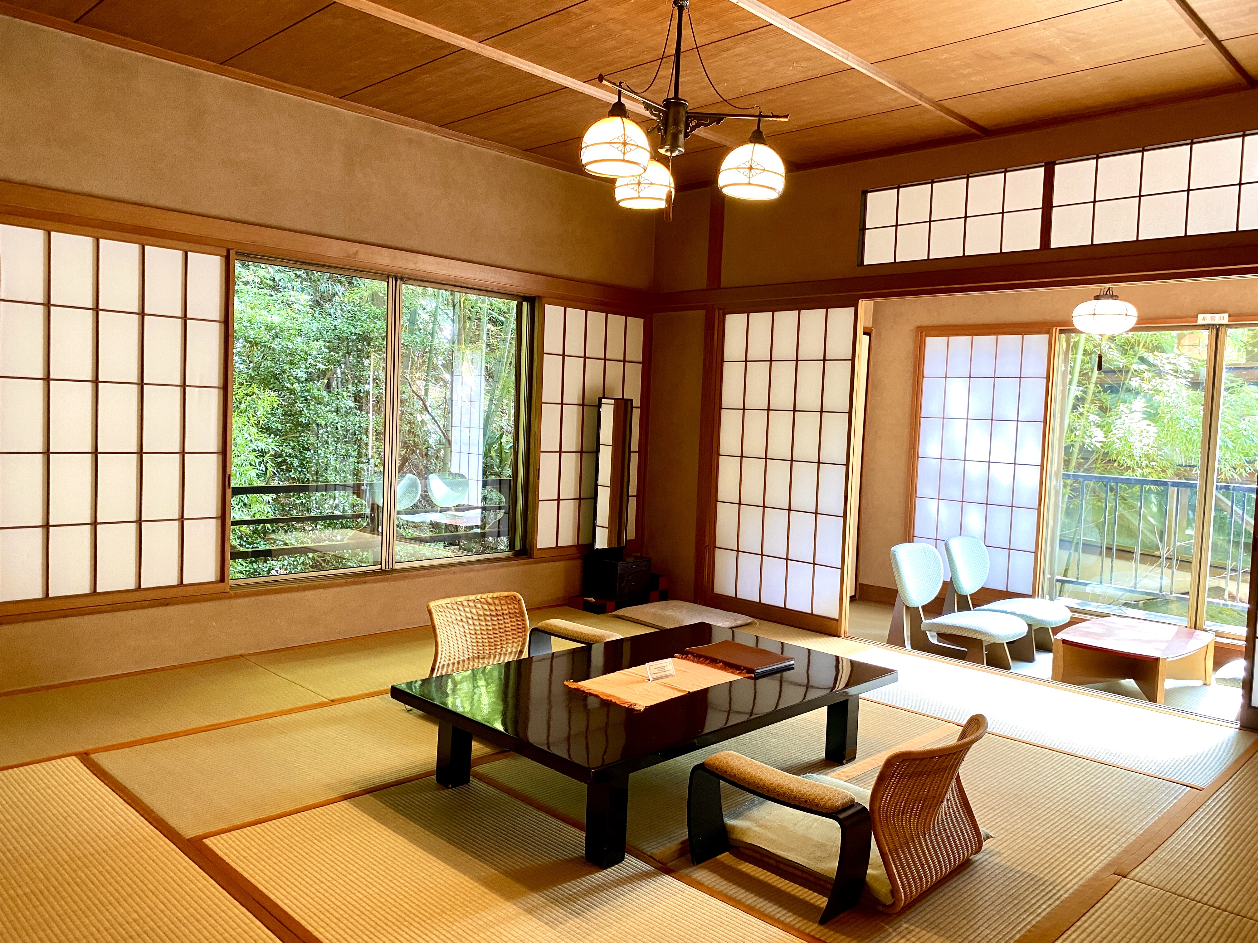 宮ノ下温泉の高台に建ち竹林に囲まれた宿で、「四季の湯座敷」武蔵野別館。館内はエレベーターの中まで畳敷で、浴衣と足袋で過ごせます。露天風呂付きのお部屋あり。